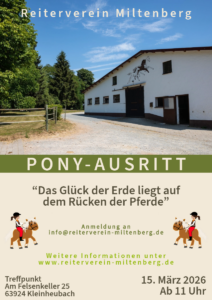 Unsere Pony-Ausritte sind wieder da und gemeinsam werden wir auf unseren Ponys und Pferden durch die wunderschöne Kleinheubacher Landschaft reiten und jede Menge Spaß haben. Ihr müsst keine Erfahrung im Reiten haben, sondern nur Spaß am Abenteuer und an den Vierbeinern 😉. Unsere Betreuer werden euch vom Boden aus führen und begleiten.